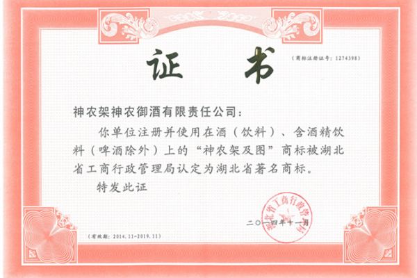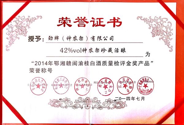 榮獲“2014年鄂、湘、贛、閩、渝、桂白酒質量檢評金獎”稱號