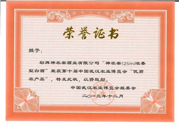 2013年12月,勁牌神農(nóng)架酒業(yè)有限公司“神農(nóng)架125ml濃香型白酒”榮獲第十屆中國武漢農(nóng)業(yè)博覽會“優(yōu)質(zhì)農(nóng)產(chǎn)品”。