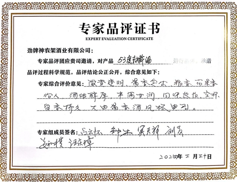 經專家一致品評認為,2018年神農架封藏酒微黃透明,醬香突出,糧香、花果香怡人、酒體醇厚,豐滿甘潤,回味悠長,空杯留香持久,大曲醬香風格典型。