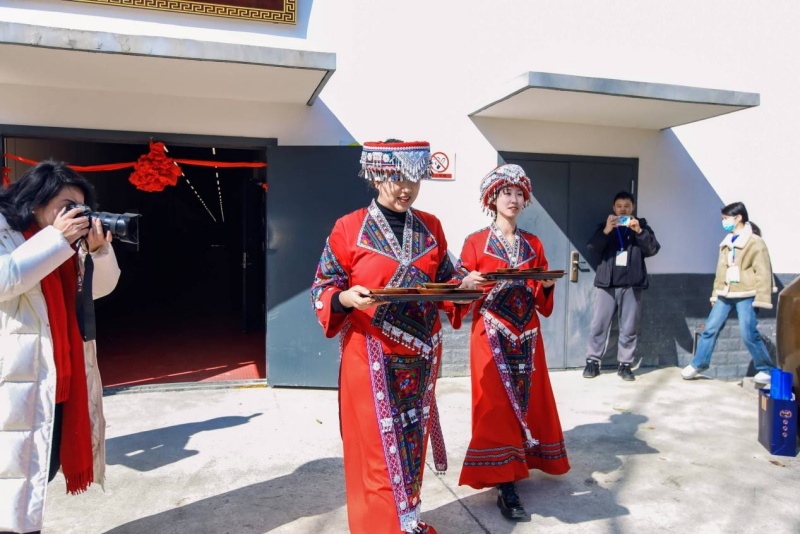 正式參觀前特別設(shè)置了攔門(mén)酒環(huán)節(jié),穿著民族服飾的廠區(qū)工作人員在樓前喊著歌、遞著酒,引得嘉賓們一陣叫好,掌聲不斷。